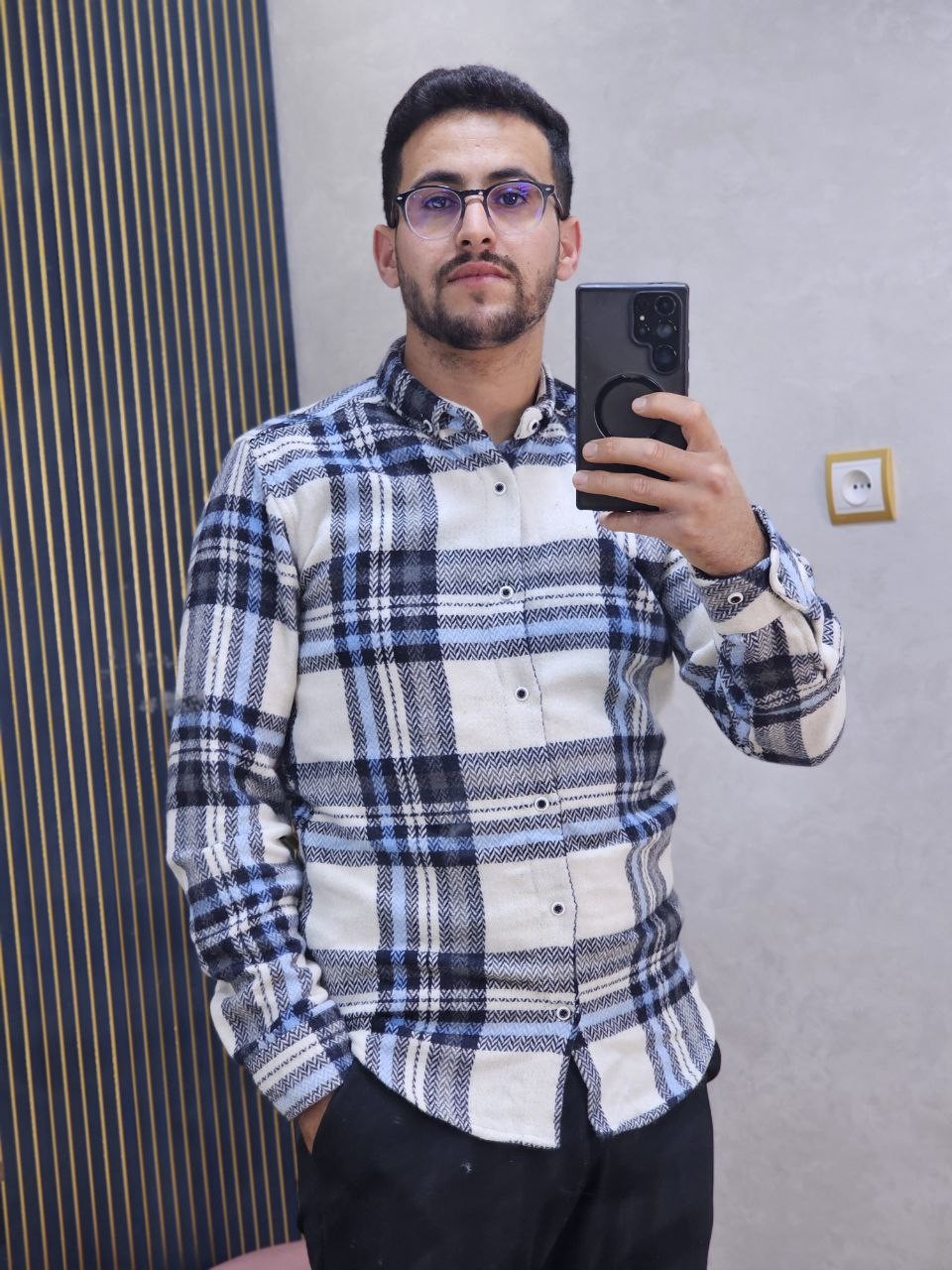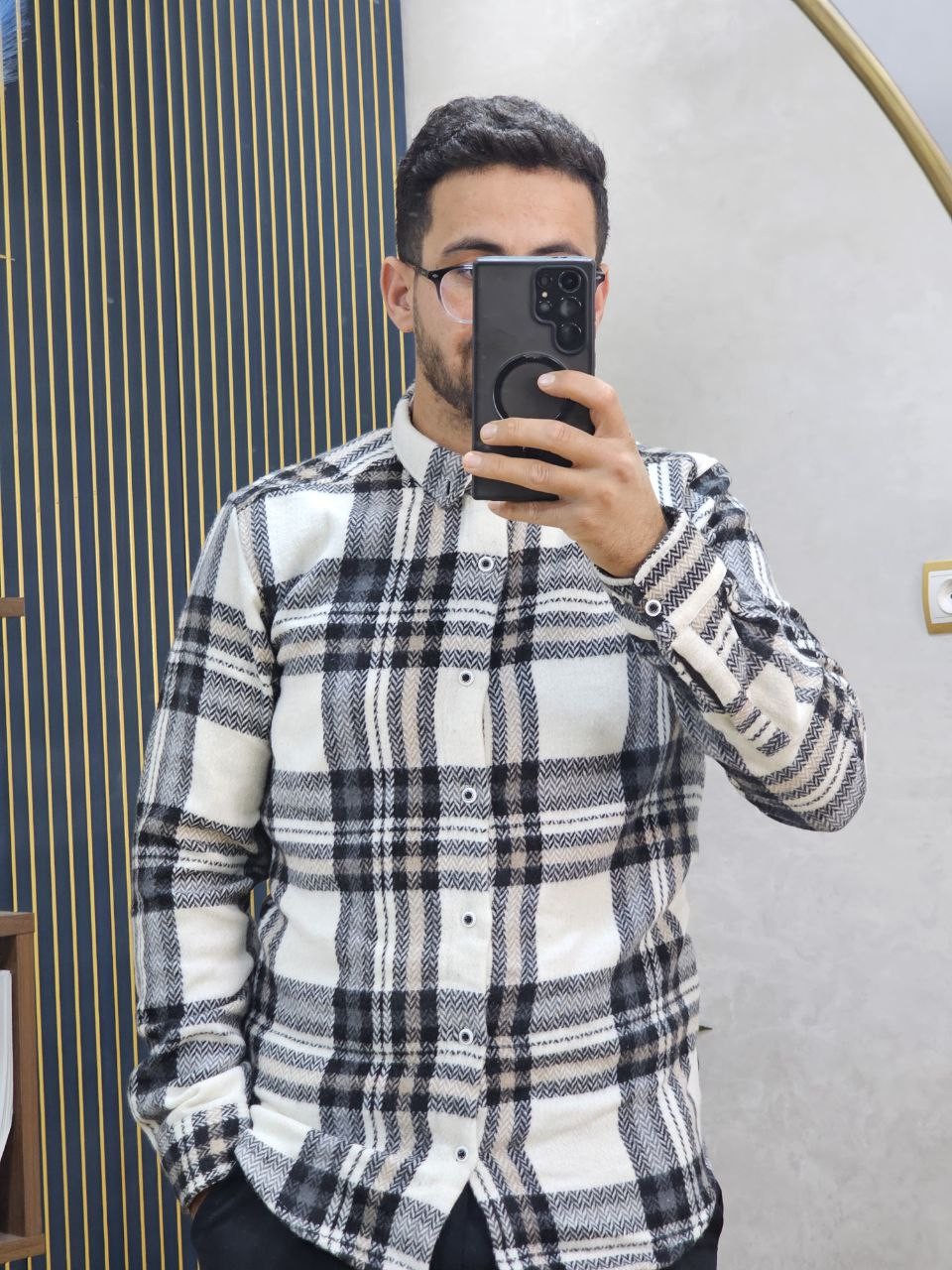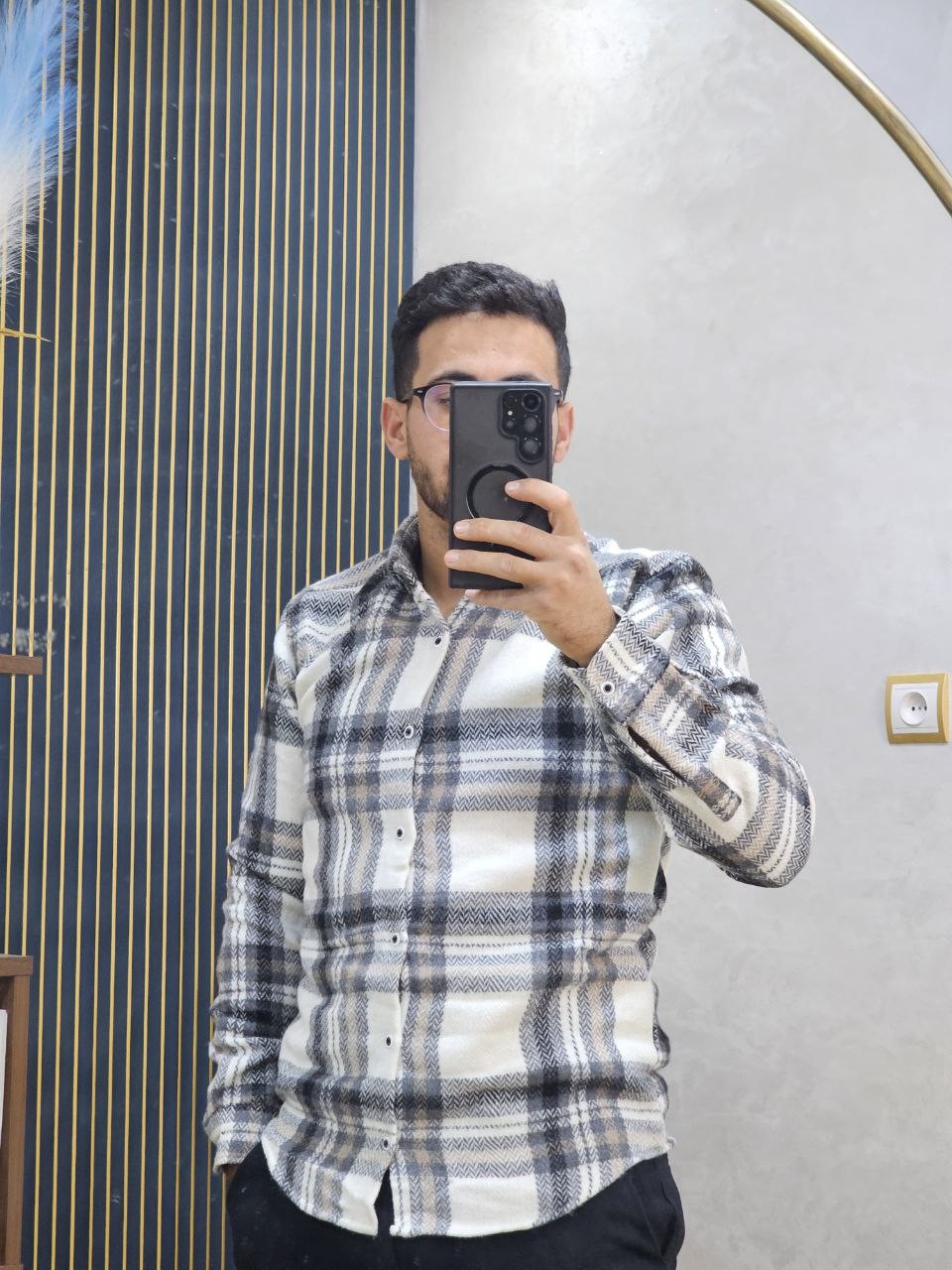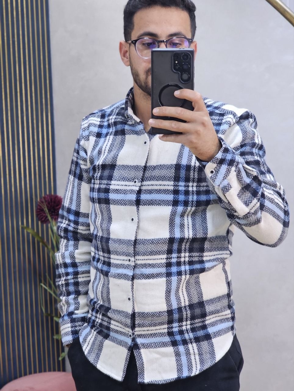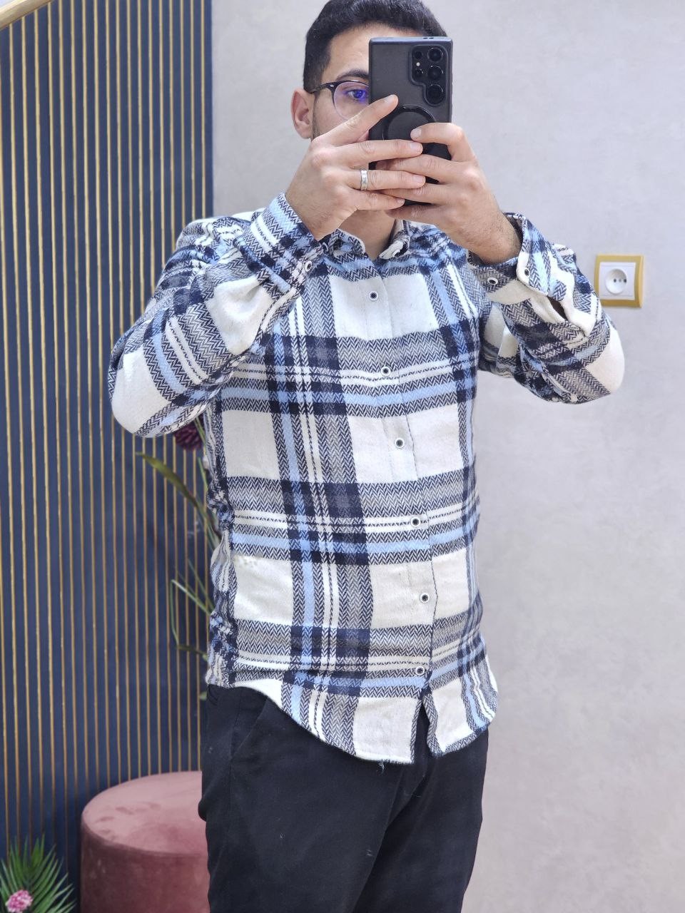 قميص رجالي ثوب قطن غليظ بجودة عالية، كيجي دافئ ومريح فلبسة النهار كامل. تصميم كاروه كلاسيكي مع لمسة عصرية، كيزيد الهيبة وكيبان منسّق بلا مجهود. الثوب غليظ ومقوّى، ماكيترخّاش وكيحافظ على الشكل ديالو حتى بعد الغسيل. مناسب للخروج، الخدمة، ولا ستايل كاجوال شيك فالبرد.