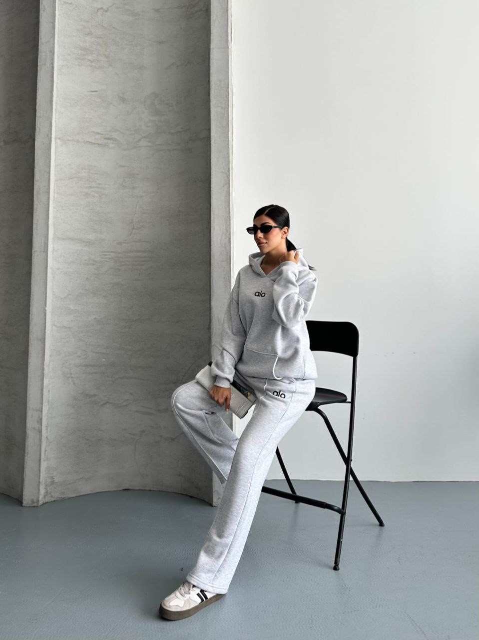 طقم رياضي أنيق بلون رمادي ناعم يجمع بين الراحة والأناقة. مصنوع من قماش قطني ناعم بلمسة فاخرة، يتكوّن من هودي وسروال واسع بستايل كاجوال عصري. مثالي للإطلالات اليومية أو السفر، مع حذاء رياضي أبيض لإكمال اللوك البسيط والأنيق